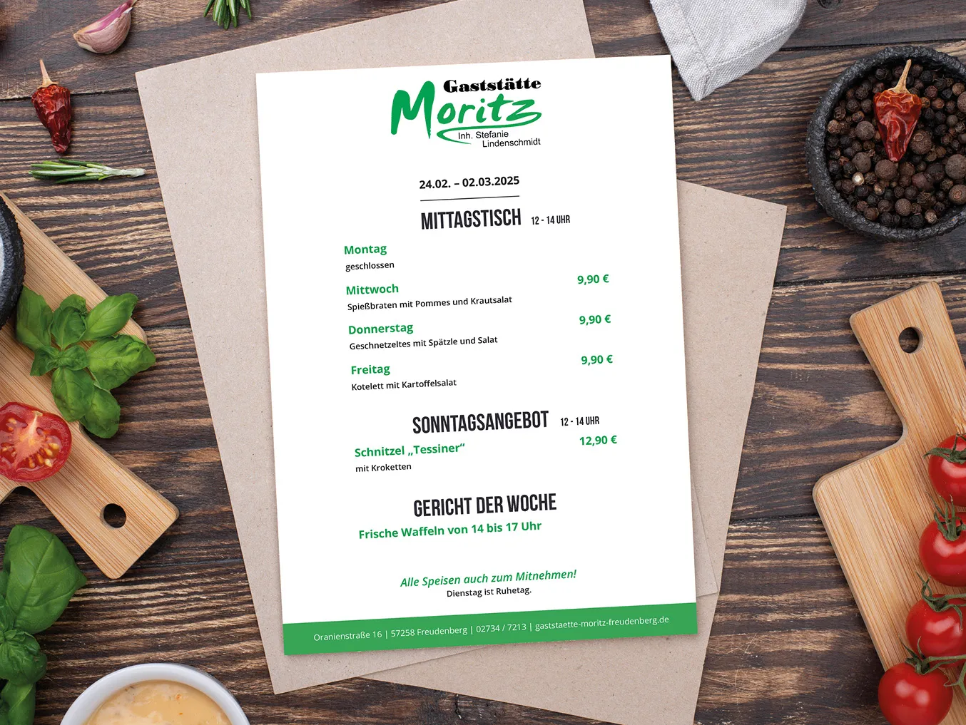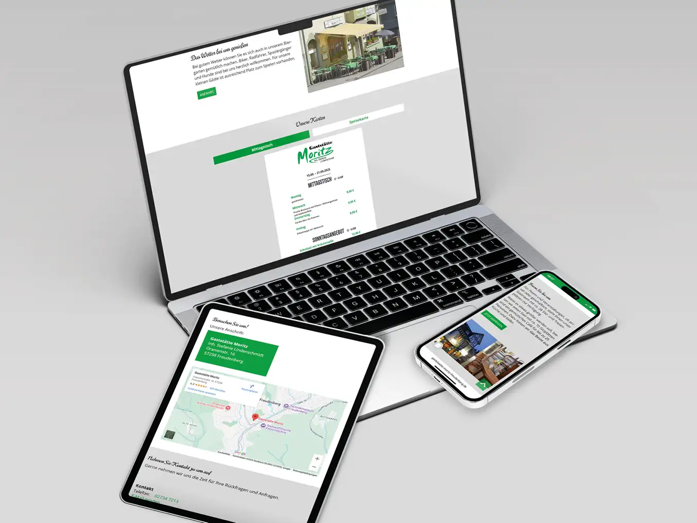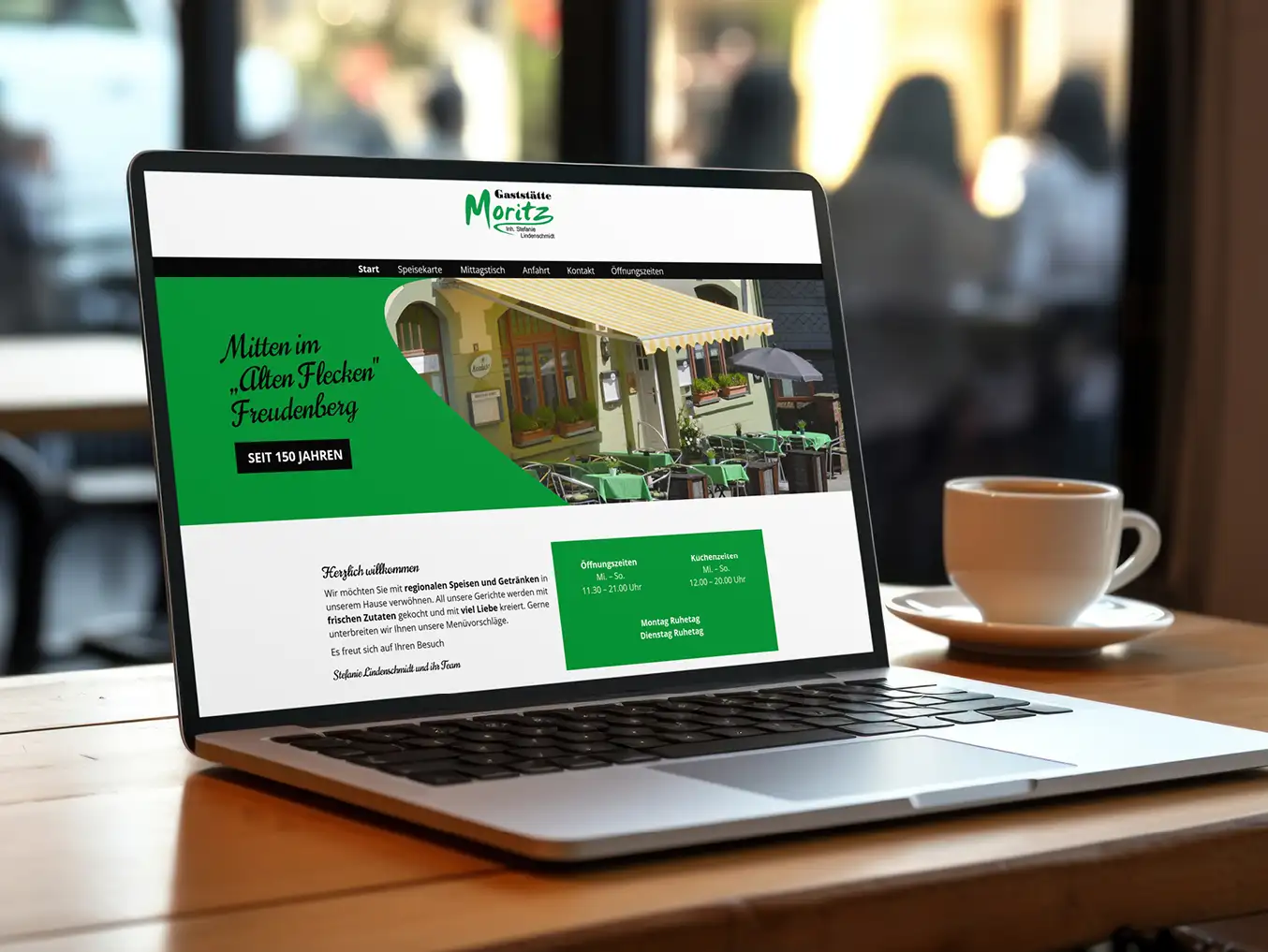 Für die Gaststätte Moritz in Freudenberg entwickelten wir als Schlossberg Werbung eine moderne, benutzerfreundliche Website. Ziel war es, die regionale Gastronomie online optimal zu präsentieren und Gästen einen schnellen Überblick über Angebote und aktuelle Speisekarten zu geben.